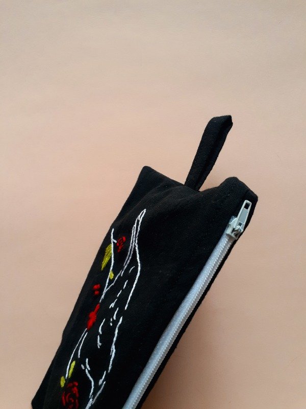 Confeccionado en tusor negro 100% algodón con cierre y bordado a mano.