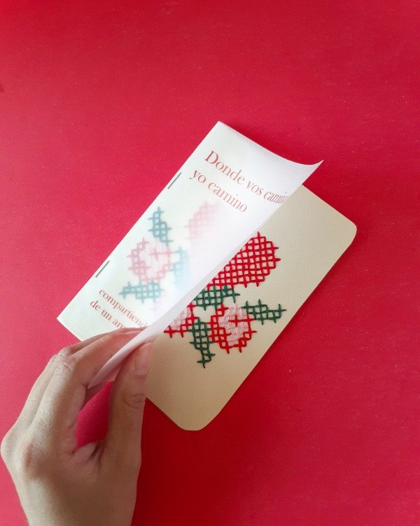 • Portada en papel vegetal con poemas de autoría propia "Donde vos caminas, yo camino. Compartiendo la adrenalina de un amor eterno".