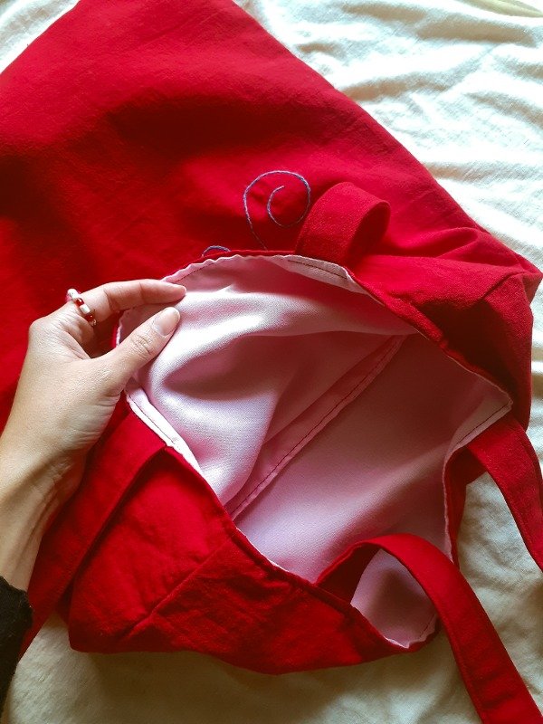 La tote es de tusor rojo, bordada a mano en color celeste y forrada con bolsillo interno en color rosa. Este modelo no posee cierre.